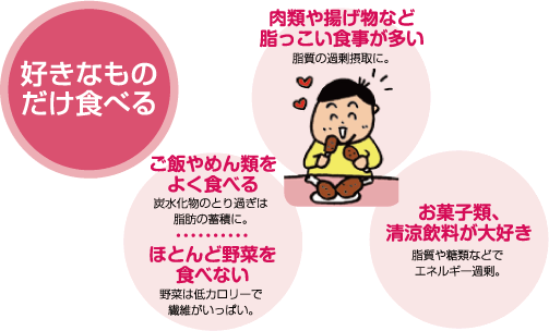 内臓脂肪の蓄積がみられる人には、生活習慣の面で特徴的な傾向があります。食事面では、脂肪や糖分を多く摂取するのが特徴です。早食いや過食、食事時間も不規則で、高カロリーの夜食、おなかがすいていないのに食べるといった傾向がみられます。